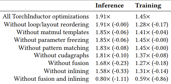I’m trying to reproduce the “Without inlining” ablation from the PyTorch 2.0 paper (the table that reports speedups for “All TorchInductor optimizations”, and then “Without inlining”, “Without fusion”, and “Without fusion & inlining”, etc.). My research goal is to turn off inlining (as well as other optimizations) in TorchInductor while keeping the rest of the pipeline intact, so I can attribute speedups precisely.