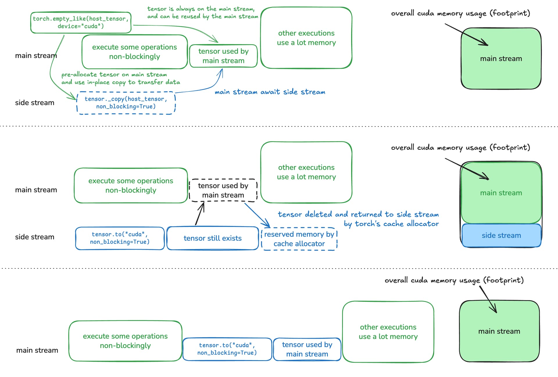 In other words, although the tensor copied from host is primarily used in the main stream, it’s created in the side stream so it will be collected and returned to the side stream by the cache allocator. The freed memory goes to the “reserved memory” associating with the side stream, and cannot be (re-)used by other operations in the main stream. The cuda memory footprint comparison is shown in the diagram below.