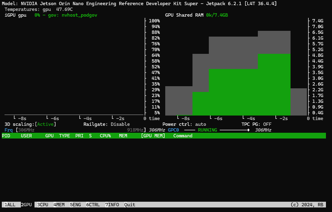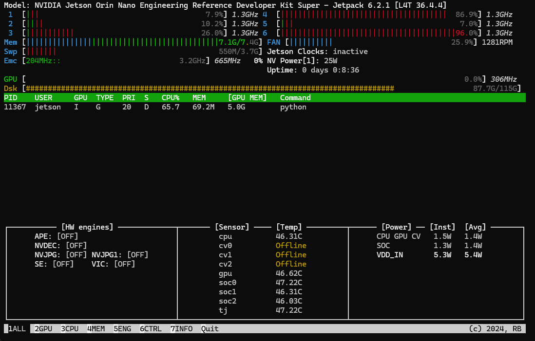 Notice that all the tensor sizes from (100, 100) up to (10000, 10000) are printed. I can confirm that we have an OOM incident occurring, by observing the jtop window. This is the last frame of jtop that is sent over SSH prior to the Jetson Orin Nano crashing. Note that I am using SSH, with the GUI disabled (sudo init 3) such that there is minimal overhead for competing GPU compute/memory.