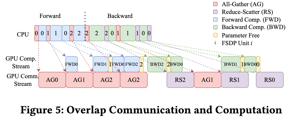 I have a question regarding Figure 5 in the PyTorch FSDP paper (Overlap Communication and Computation).